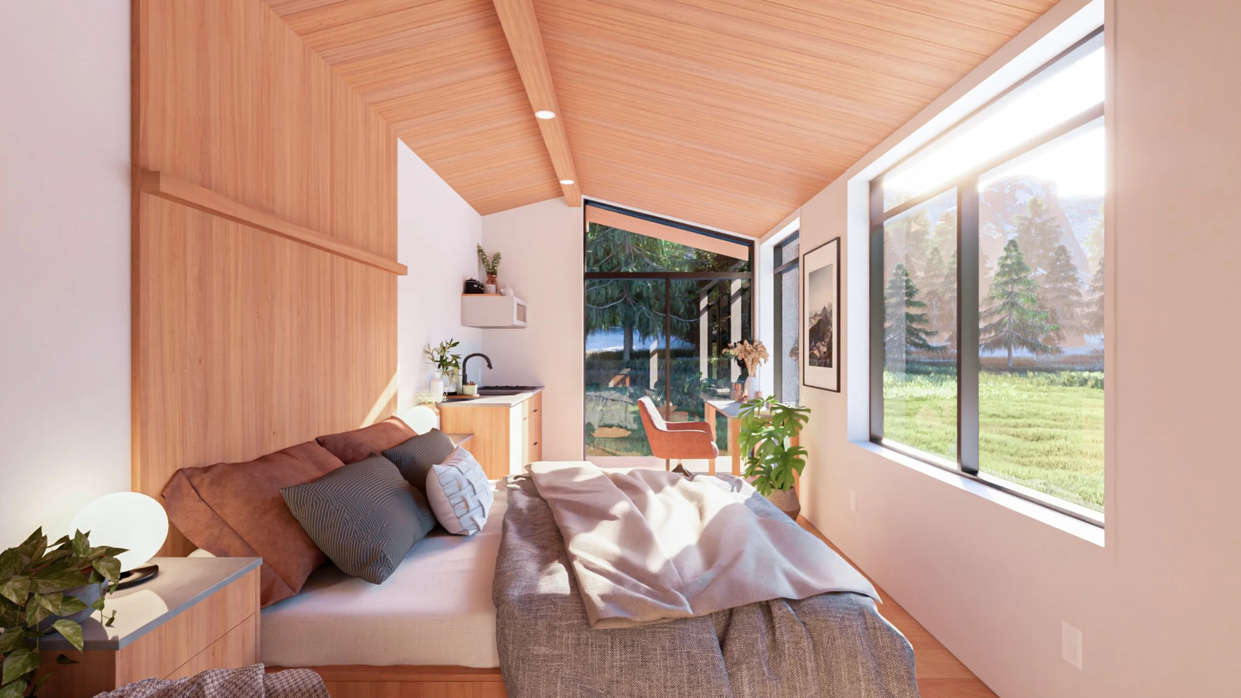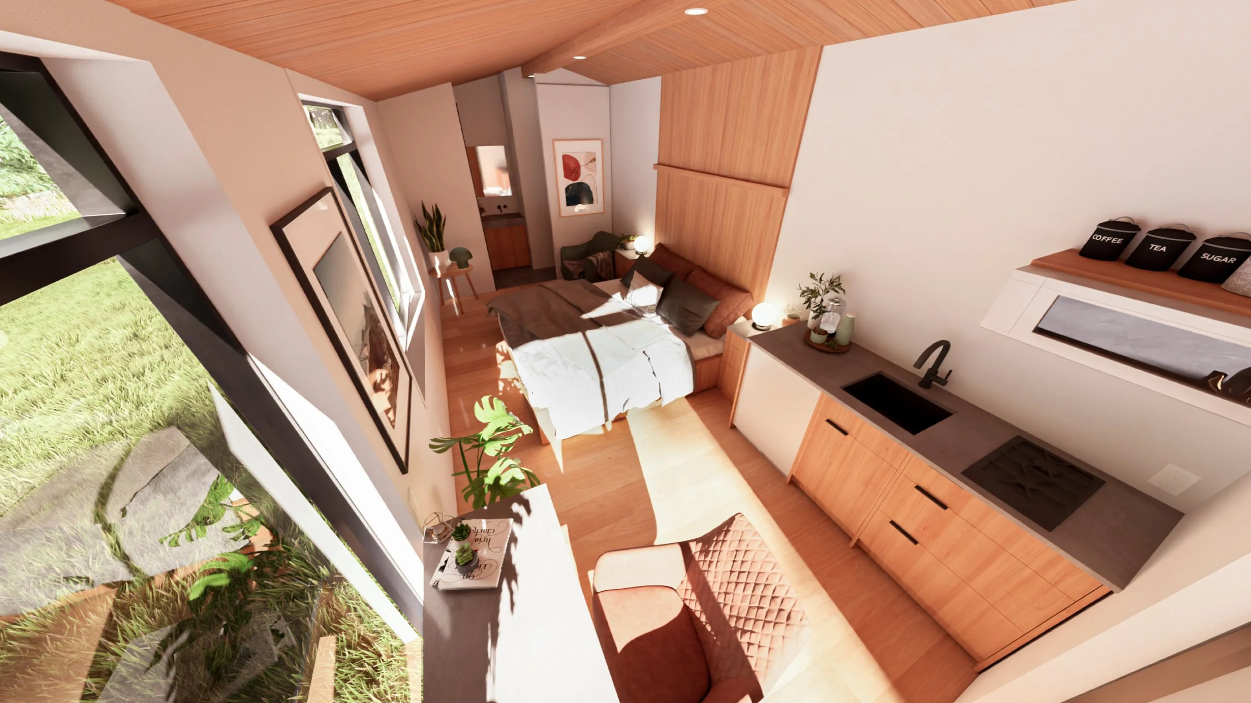 The Modular Studio is a compact, high-end 28′ × 10′6″ base module (with a covered deck) designed for use as a luxury guest house, home-office, or studio retreat. Floor-to-ceiling windows, an open layout, and premium finishes create a bright, inviting space that prioritizes views and natural light. Built for placement on a permanent foundation and engineered to meet code, it blends minimalist living with refined design. Optional configurations allow use as guest suite, short-term rental, or creative workspace.